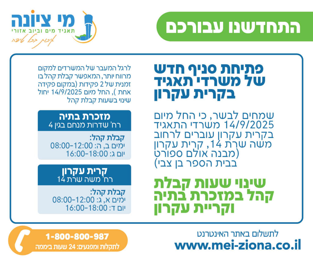 * קבלת הקהל מתקיימת בסניף מזכרת בתיה
